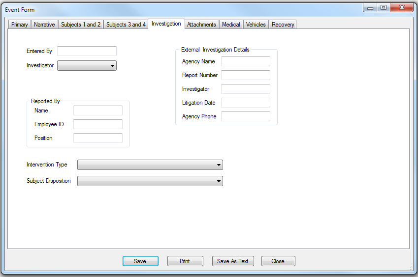 The Investigation tab requires you to record details relating to the internal and external investigation of the event: