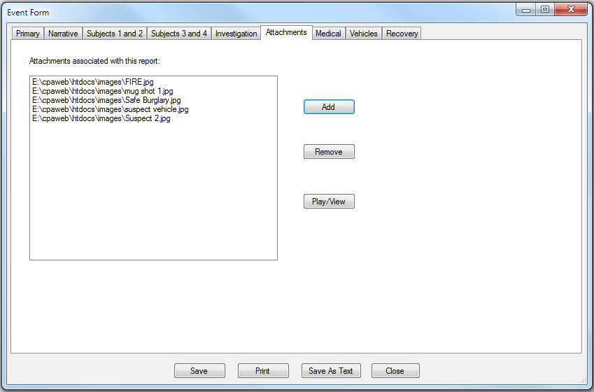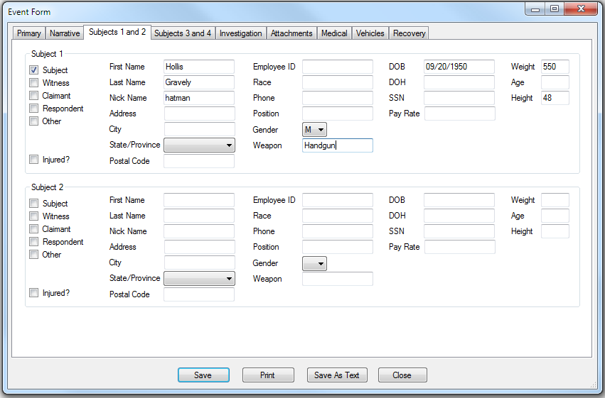 The Narrative tab allows free form entry of text related to the event. The Subjects tab provides searchable details for up to four people associated with the event as shown below: