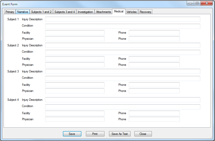 The Medical, Vehicle and Recovery pages provide space for additional details related to the event.