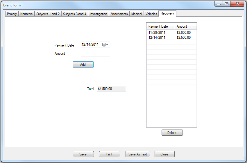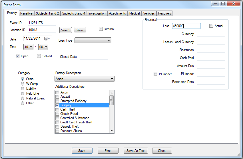 The tabbed incident report form provides for the entry of all the details for any type of event with required items in bold type. The main tab for this form is shown below: